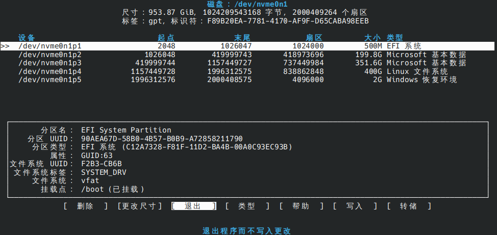 cfdisk 是 fdisk 的 TUI 版本,提供了基本的分区功能和基于 curses 库的用户界面。